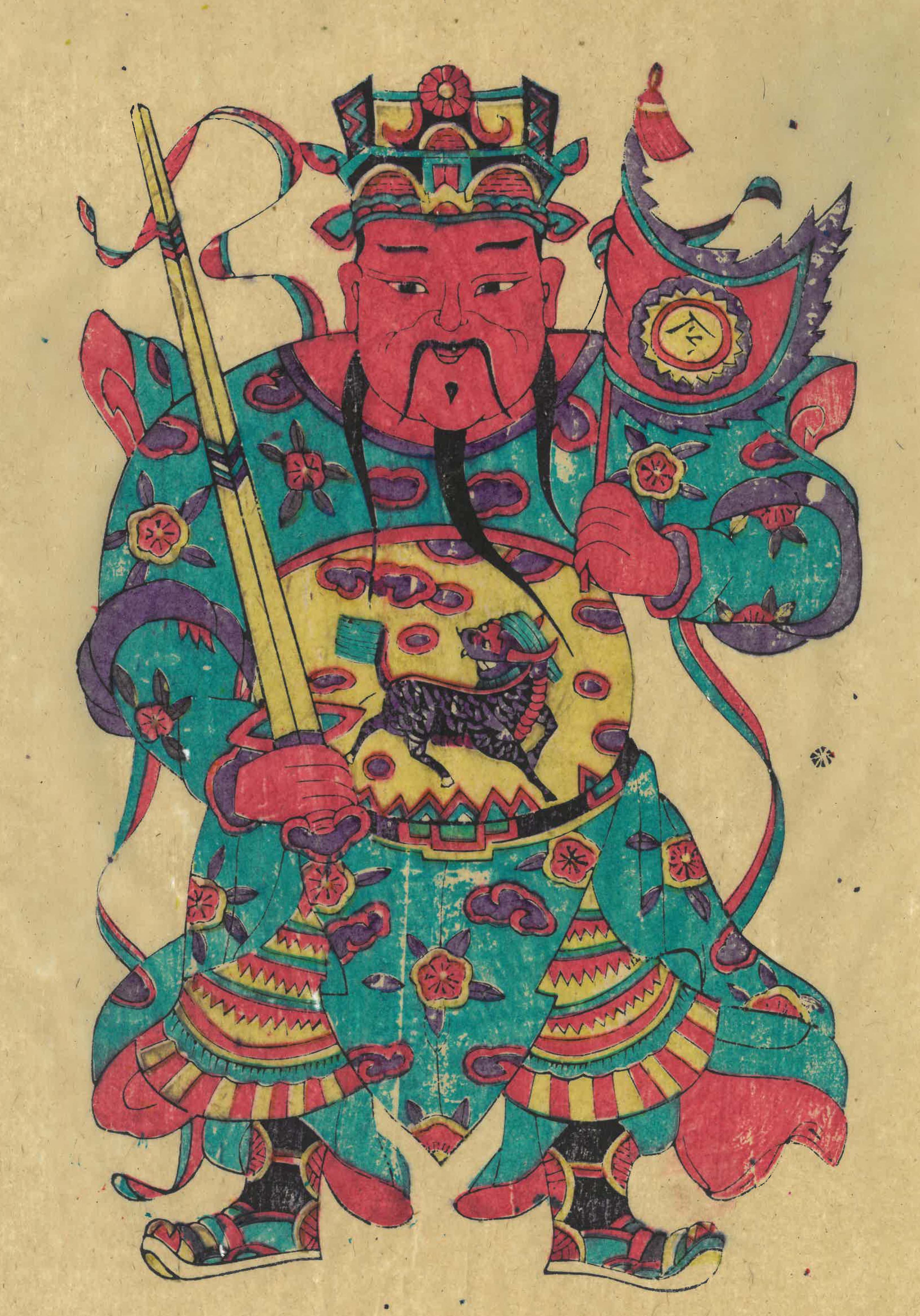 單扇門武門神,將軍型,正面坐像,手執鐧與令旗,畫中人物為秦瓊。