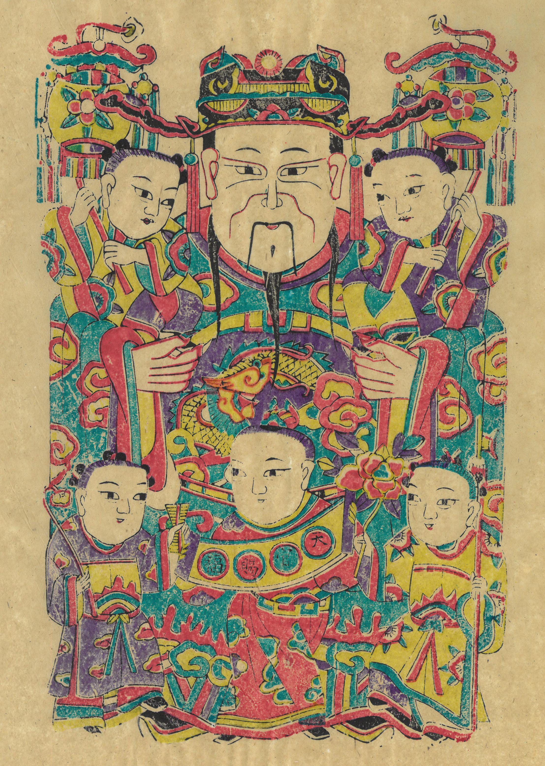 濰 坊 年 畫 「 五 子 登 科 門 神」