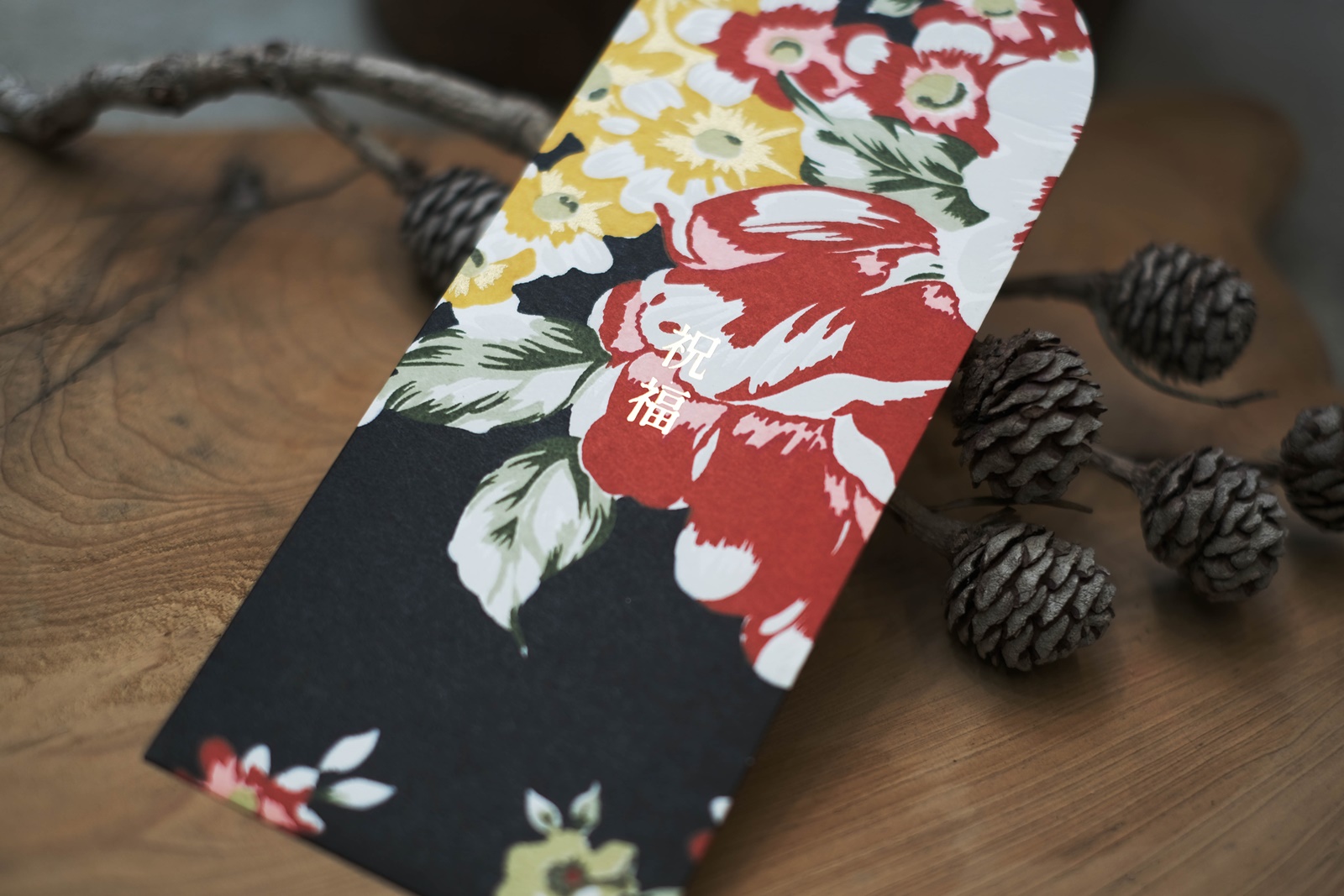 此款紅包袋所使用的花布紙是以[十層套色]層層疊色印刷,需要極度精準、嚴謹的印刷技術,具有豐富、精緻的層次,此外還加入金、銀色點綴,為的是將台灣客家文化特色的花布紋樣延續下去。